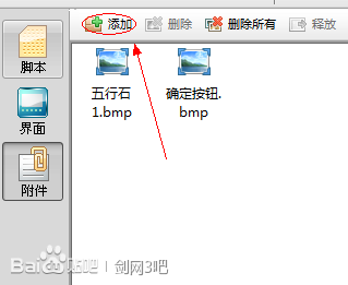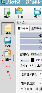 找到按键精灵左面,有个附件的按钮,点击一次,把我们刚才截取到的五行石图标,确定图标,添加到附件里面