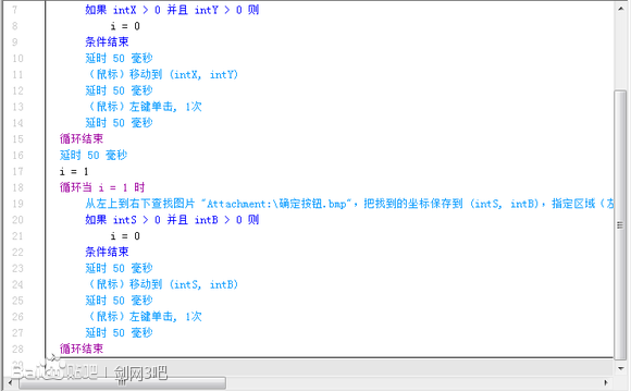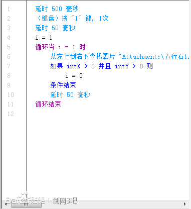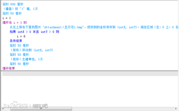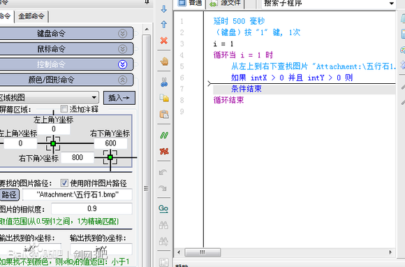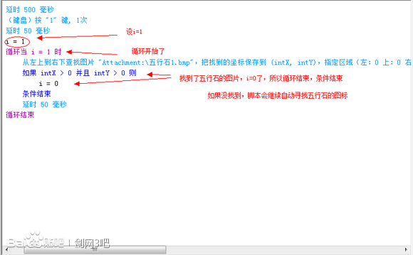 “i=1”是一个固定值,然后脚本开始循环找图,在800X600的分辨率内找五行石的图片,如果找不到,i还是等于1,继续寻找五行石图标,如果找到了i=0.所以循环就结束了。可以进行脚本的下一步。有的朋友这里很难理解,可以看看下图。