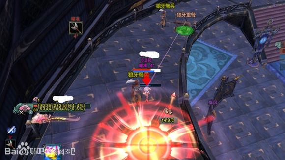 BOSS下90%以后,【狼牙重弩】会被激活,我们这个阶段主要的目标就是躲好地上的红圈黄圈,打掉一楼到二楼间的狼牙重弩,不是旁边的弩兵哦!经过老一的训练,我相信大家都对躲圈圈有了一定的基础了!