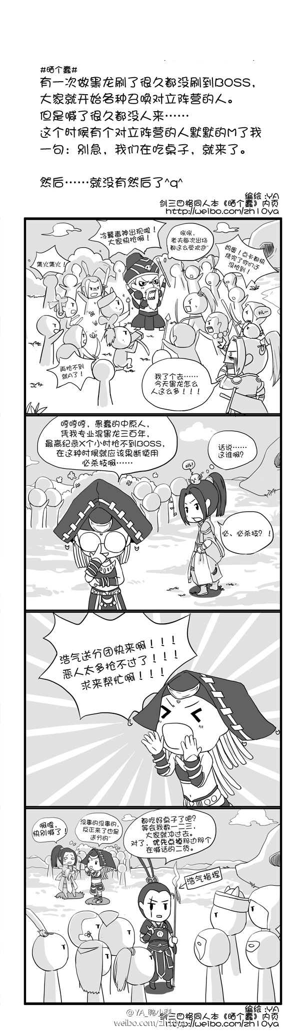 #晒个蠢#艾玛我终于还是把这个过期梗画出来了,在黑龙更新之前,恶人总是万年霸占boss点(虽然现在也是),相互抢不过了就会开始各种频道的求对立阵营来送分,来帮忙……有一次刷着刷着,还被对立阵营的人密聊了“我们在吃桌子,等着!”……#剑网三#(双梦镇的黑龙故事)