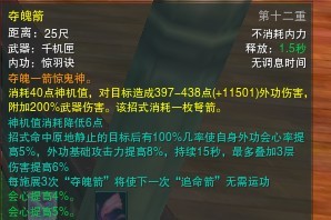 夺魄箭:拥有着常规输出技能中最高的攻击加成(所谓常规技能对应到各职业就是四象轮回,普度四方,蚀肌弹,穿云,夕照雷峰,阳明指,蝎心,赤日轮/幽月轮,三环套月等),在攻击相等的状态下,夺魄箭的加成完全超过了其他同类技能,它的攻击加成主要看最终面板攻击。