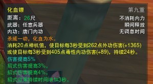 化血镖:如果说蛇影是最强的常规DOT技能,那么惊羽的化血镖就是最弱的常规DOT技能,注意这是说惊羽的化血镖,因为田螺的还是挺不错的。它存在的唯一理由就是有着不短的持续时间,同时可以通过另一个技能来刷新,运用得当的话,一场BOSS战只需要开局丢一下就能全程保持,它的攻击加成主要看基础攻击。