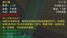 穿心弩:它是一个持续DOT技能和致死技能的结合体,所以在PVP里它是一个很强势的技能,但放在PVE里,却表现非常一般,好在伤害比起化血镖要高上30%左右,虽然有1.5秒的读条,但又可以在移动中施放,真的是让人又爱又恨,它的攻击加成也主要看基础攻击。
