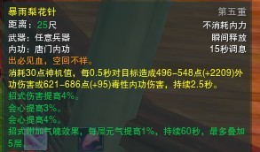 暴雨梨花针:虽然有着5%元气的秘籍,但技能本身孱弱的攻击,使得它更多的是作为一个穿插性的技能,当然,刷奥妙和叠BUFF是它的一个长处,它的攻击加成主要看最终面板攻击。