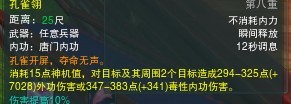 孔雀翎:不管惊羽还是田螺,孔雀翎都是不在理想输出循环之列的技能,但是实战中用起它来总是不会亏,瞬发,中上的伤害,小范围群攻,不长的CD,最重要的是非常低消耗的神机值,它的攻击加成主要看最终面板攻击。