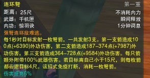 连环弩:因为它不需要用神机值就可以施展,所以在以往的惊羽输出中,都将它作为神机值低到不够用穿插技能时的穿插技能,不过目前连环弩3下读完的攻击已经和2发夺魄箭不相上下了,它的收益也就提高了相当多,当然1分钟的CD是它的硬伤,又一个为PVP买单的悲剧技能。它的攻击加成主要看最终面板攻击。