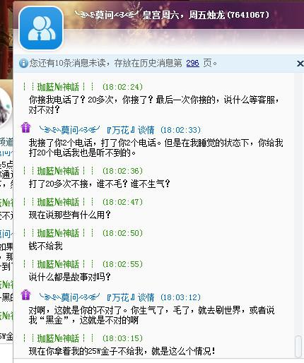 神逻辑录音:莫问黑金最新进展:3月11日凌晨三点,也就是基本上帮会都已经没人的情况下,谈情上线在莫问金团群里装模作样的发表一番言论,对帮会人员进行劝退,而实际是上游戏把帮会在线活人全部提出帮会,又黑了帮会九十多万的帮会资金。莫问帮会原本在浩气排名第十,今天前50已经找不到莫问。比