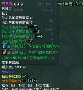 属性是外功破防命中无双,孔是会心的一看是很变态的鞋子用了之后破防空BUFF都有,1188但是自从,无我被和谐之后,叠刃被改之后破防没有那么重要了因为我测试过这2个鞋子剑纯破防推高了比如用这个无畏鞋子,我加上破军BUFF,会有,1428的破防打出无我最高伤害大概在3.6W左右但是呢会心也就在61左右,会效在,236左右会心率不够高。单技伤害虽然高一些。但是没会心,是不如会心的,会心概率越多,越容易叠上DPS。