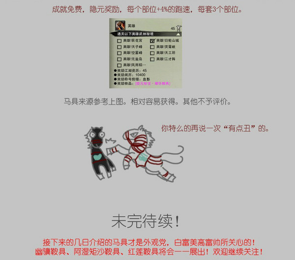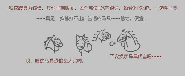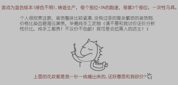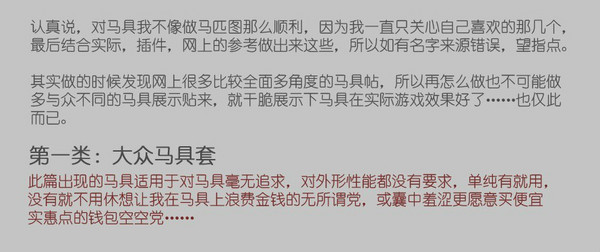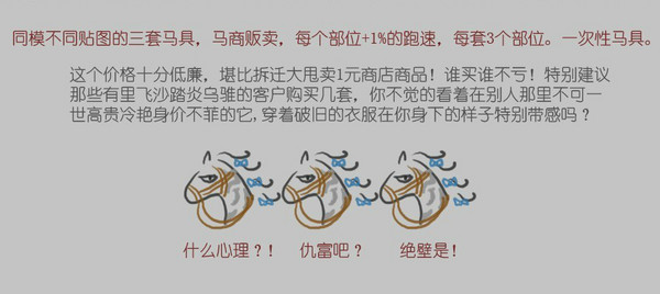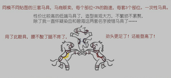 本店上期介绍了各种马屁后有客户要求再介绍下各类马具。没问题,不过因为剑3马具蛮多的,一次介绍不完,需分多次。这次就先介绍适合对马具无追求随意想买套,或者囊中羞涩又想给小马买套性价比合适的客户。走你!看不清请点查看大图。