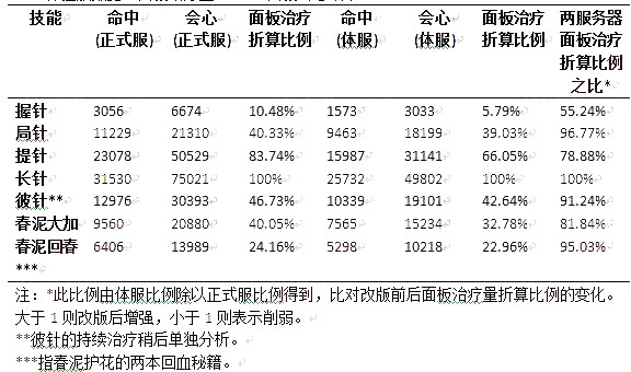 3.彼针的直接加血量也有小幅缩水。4.从表中看,长针的折算比例不变。但是秋毫的20%被治疗加成是明明白白损失掉了的,也就是说,过去的长针是自带治疗量加上裸面板的1.35倍治疗量,现在只有1.15倍。