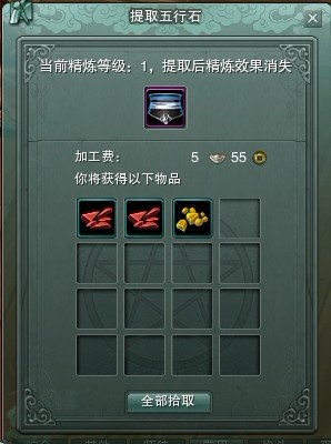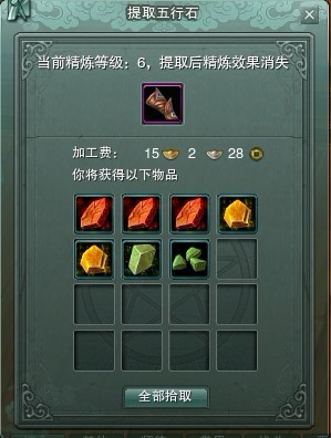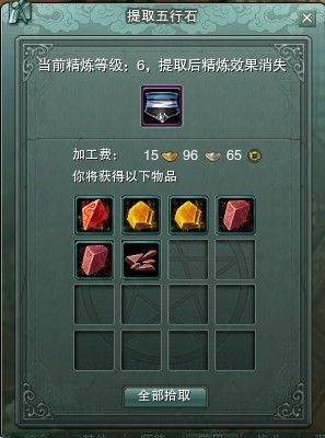 3、精炼1级的剥离加工费在5银25铜以上必定产出7级五行石,否则则为3个6级五行石