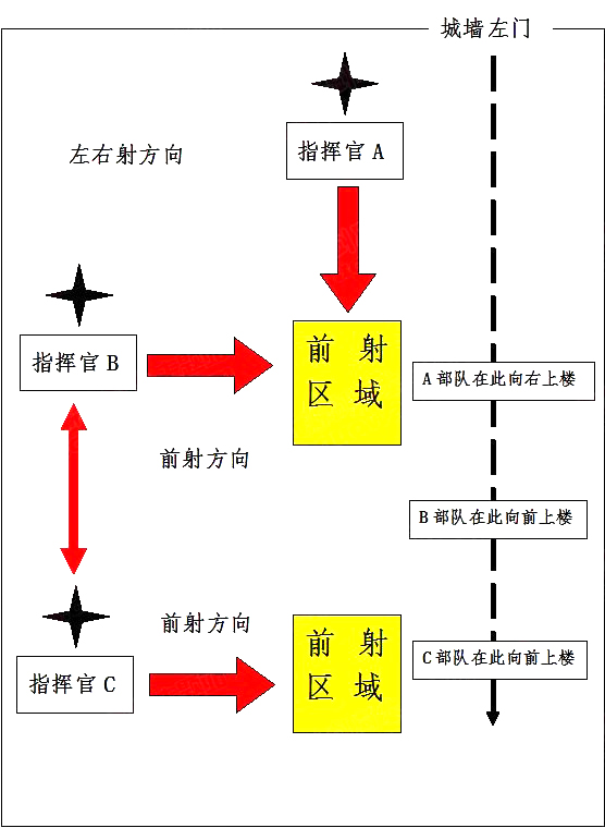 然后,在每一个我方指挥官处安排一个人(弩箭伤害太低可以完全无视),两侧城墙完全相同故共需要六个人。然后找一个人在下面空阔处守着城门等小怪刷新。看到小怪出现马上喊,等小怪跑到指挥官A和B的前射区域时马上发令NPC向前射箭射一次,此时怪A部队和B部队如果还没死会分别走自己的楼梯上城墙。而剩下的一波怪C部队会一直走到最里面,同理,等这群小怪到了指挥官C的前射区域时同样发令NPC向前射箭射一次。如此即可很轻松的秒掉前两波小怪。后面两波怪血量较厚,向前射箭射一次还无法秒掉,则需要等他们上城墙以后继续操纵指挥官向左或者向右射箭再清掉。如此反复等四波小怪全部清掉以后,就会刷新一个小BOSS,直接冲上去rush掉,恭喜你们,终于可以开启城墙大门然后去找BOSS发泄抑郁了有木有。