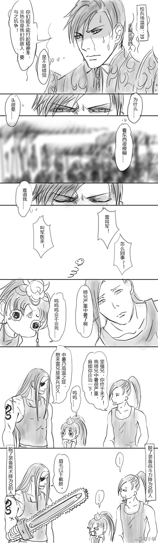 于司早与雷不哀系列。夏天太热,坚持穿装备而不换成裤心背衩的人都会中暑!花坚强叔叔教大家如何治疗中暑~~脱了装备战斗力为0的人遭遇脱了装备医疗术为0的人,唉~