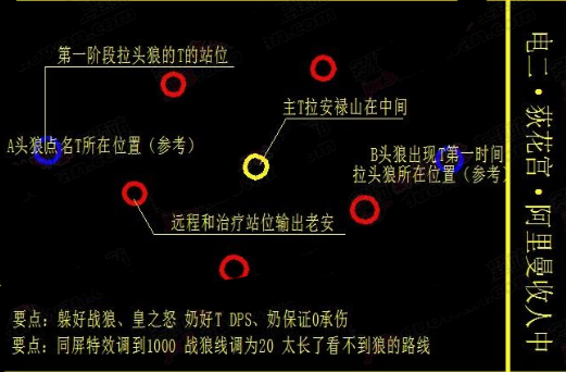 主T拉怪在中间,一个T去头狼出来的点接头狼仇恨,奶花春泥要给头狼T套好,这个伤害超级高,据说暴击几十万,DPS被咬必死。三个奶毒看好全团,奶秀看好头狼T。