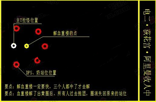 这个阶段会出血重楼,中血重楼的人首先要不动,等三个血重楼都出来了后,去图中所标的点解掉血重楼(别**的一个人中了就开始动,你会死的,一定要三个人中了才去解)。