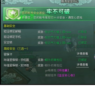 全部绑定,既可以增加帐号安全,又有体力、精力、轻功值上限,并且增加5%声望获取。