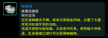 活动期间,侠士完成每日大战秘境日常,“明争暗斗夺物资”马嵬驿阵营日常及洛阳、长安战乱场景茶馆日常,即可获得1枚【峥嵘佩】;完成“天欲倾兮挽狂澜”活动日常,将会获得3枚【峥嵘佩】。