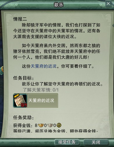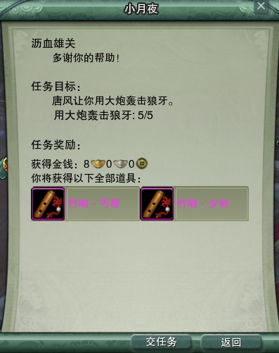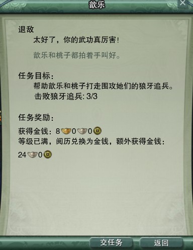 任务奖励:30金, 300侠义值,1500江湖贡献,10监本印文,3个【峥嵘佩】,以上数值均不占用周上限。