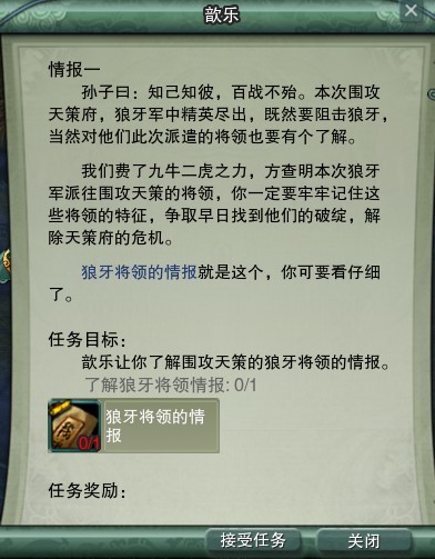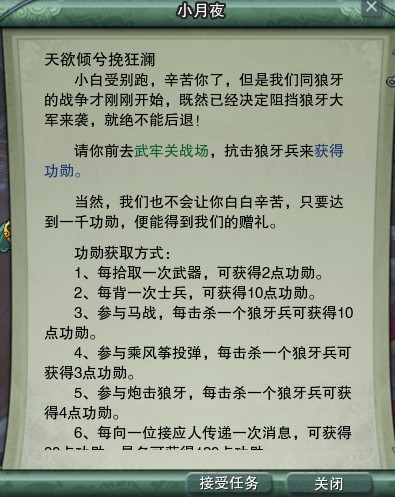 任务内容:侠士在武牢关处协助各派弟子抗击狼牙兵,即可获得一定的功勋值,进行不同的方式,获得的数值也不相同,功勋值达到1000点时,即可完成该任务。