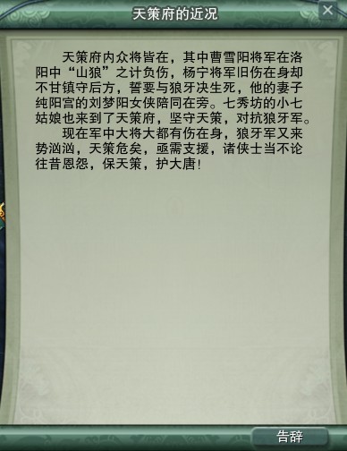各大门派派出了部分年少弟子,避人耳目,暗中打探狼牙军动向,协助江湖群雄驰援天策府,欲将狼牙大批援军截杀在天策府外的武牢关。