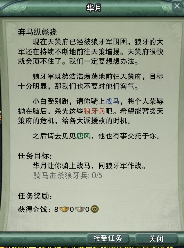 【奔马纵彪骁】:这个任务小编做时遇到不少玩家不会做。特别注明下。接了任务后,你的包里会出现一匹马