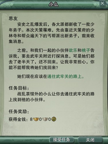 活动开启后,侠士可在长安·战乱及洛阳·战乱场景的茶馆旁寻找到少林及丐帮两派的少年弟子小么和小月夜。交谈之际小月夜告诉侠士天策正处危难之时,望能鼎力相助,前往战乱·洛阳武牢关,找寻小月夜其他门派的同伴。