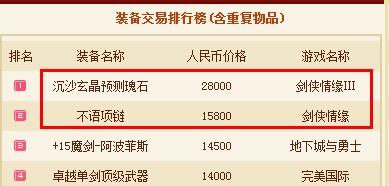 上周(10月28-11月3日)网游总交易排行中,剑网3以28000的最高价格占据榜首,并且其中的排名第二的也是剑网3的毕业项链【不语项链】,拍出了15800的高价。剑网3的土豪们可以跟我交个朋友么?!!