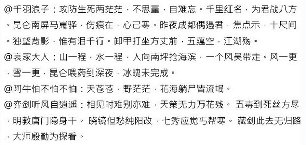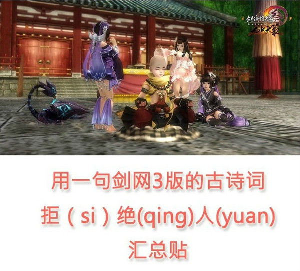 《剑网3》用一句剑网3版的古诗来委婉的拒(si)绝(qing)人(yuan),同人娘先来:君住南屏山,我住昆仑巅。日日思君不见君,攻防死情缘。