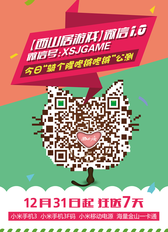 “西山居游戏”官方微信正式公测,微信搜索xsjgame或者扫海报二维码即可关注!有微信的地方,就可以充值、查余额、改密码、联系客服,并有全新功能“游戏锁”限制游戏登陆,严防账号被盗。12月31日起,“西山居游戏”官方微信将开启跨年狂欢,超给力的惊喜大礼狂送7天,马上关注吧!