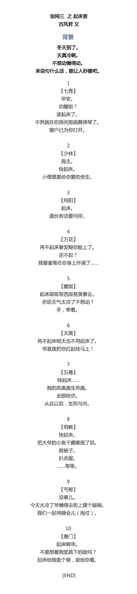 剑网三之 起床音 冬天到了,天真冷啊。不想动懒得动,来说句什么话,能让人秒醒吧。