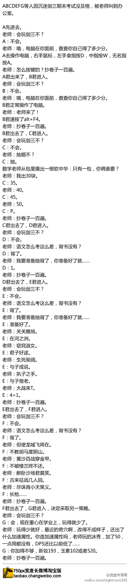 《剑网三》照着全职那个写了一个……ABCDEFG等人因沉迷剑三期末考试没及格,被老师叫到办公室。第一部分一样的因为实在觉得确实是这么操作的不好改