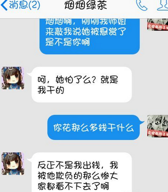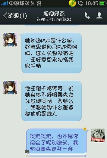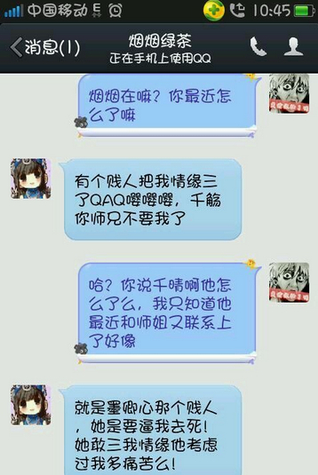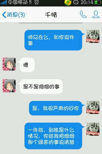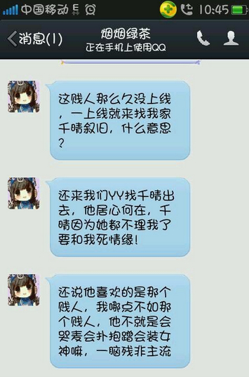 据说绿茶烟要转服要删号了,对截图表示有问题的小伙伴,楼主只能表示爱信不信,初中森还是萌萌哒,绿茶烟只是个例外,id的话,男主叫是墨千晴,傻毒就不爆了,绿茶烟要删号转服什么的,爆了也没用