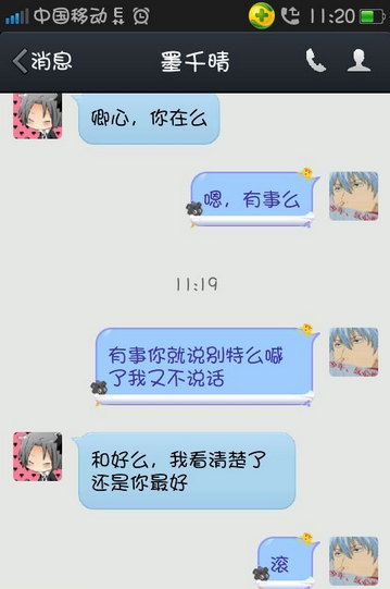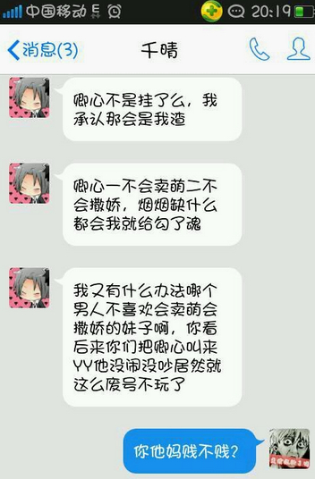 先一句甩过来,你把声音装的那么萌想干嘛,是不是要勾引我家千晴?卤煮默默回了句那是本音,我有情缘。女神大人不依不饶又是一句,你为什么对千晴那么有求必应是不是想让他爱上你!嘤嘤嘤!啊妹子你被害妄想太严重我对于被我丢出去的男人没兴趣的啊。女神大人就这么不依不饶的盘问了我好久