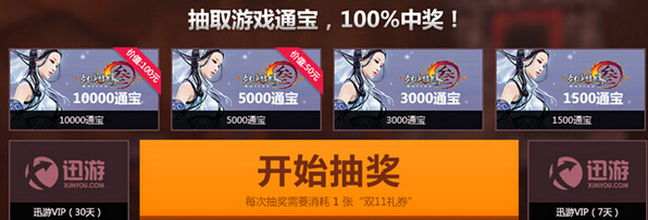 活动期间,登录迅游“双11狂欢”活动专题页面,可以通过多种途径获得“双11礼券”道具,使用该“双11礼券”可以免费兑换及抽取剑三游戏充值点卡、迅游VIP!