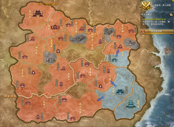 今天的据点战,浩气一共只有100+人参加,没人组织。武王城的大旗都几乎被拔。说起来都是泪,直接看沙盘吧——