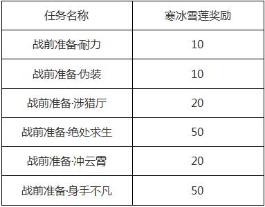 各路侠士闻讯后,前来雁门关支援苍云军。不过战场不同于江湖,侠士需要通过各种专业训练后方可加入行伍为边关效力。侠士来到雁门关后,可前往苍云堡内部,寻找各处的苍云训练官参加训练。通过完成【战前准备·耐力】【战前准备·伪装】【战前准备·涉猎厅】【战前准备·绝处求生】【战前准备·冲云霄】【战前准备·身手不凡】等六项挑战任务,可获得数量不等的【寒冰雪莲】。