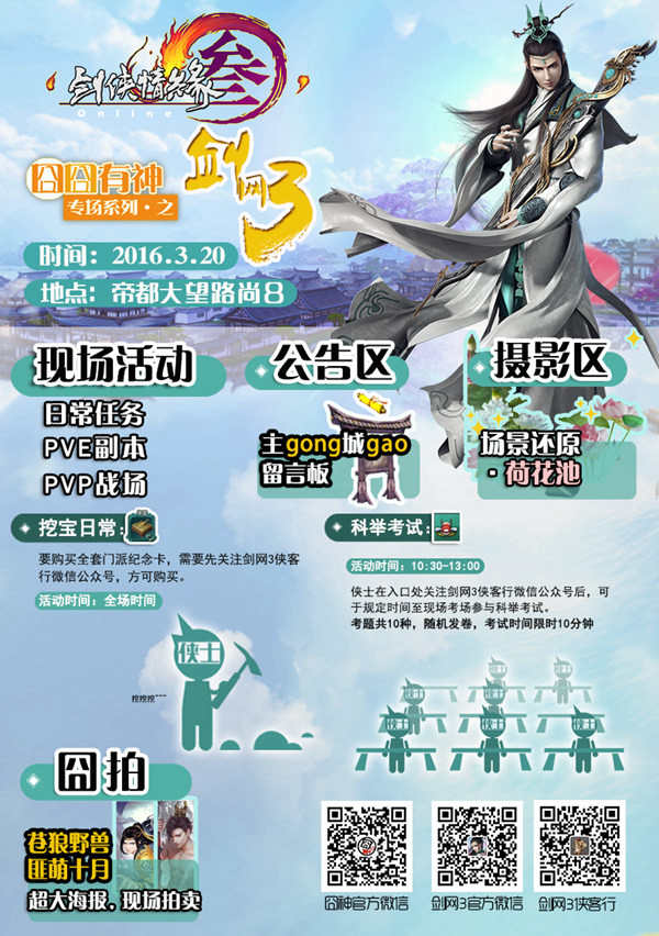 3月20日北京囧神剑网3专场副本开启/阵营开战/科举开考,多样线下版剑网3游戏静候侠士亲临!超人气绘师@苍狼野兽@匪萌十月授权作品超大海报现场拍卖!千社工作室蛋挞、青泉、银太、猫耳现场签售及舞台精彩表演,画烬工作室,恶人谷配音工作室的联合演出,COSER全员出动,联合声优现场献声,更有娇艳实景【荷花池】场照变正片!面基好机会,千万别错过!