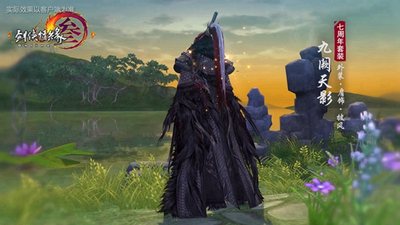 九阍九阙闭天影,云落云起归燕里。九阙天影套装以古代将军大帅形象为设计元素,采用精致铠甲与苍劲黑羽搭配,玄色套装整体厚重感十足,套装正面的敞开式设计更显侠士霸气本色。披风包裹状态下还有睚眦形象的动态粒子特效,助侠士征战天下,驰骋疆场。