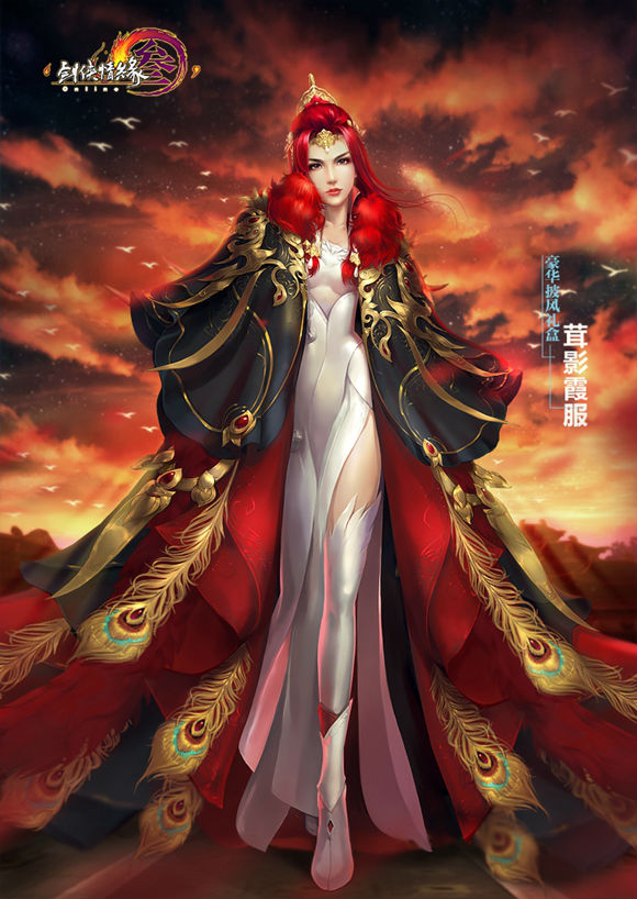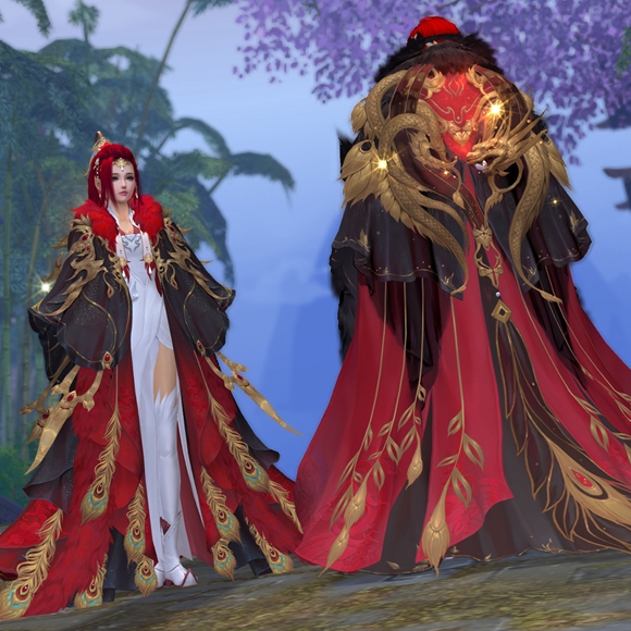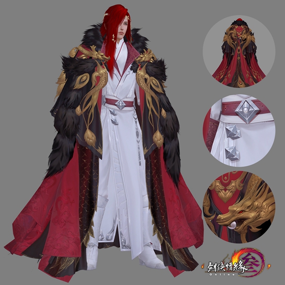 其中,披风部分采用雍容的红色与黑色的搭配,龙纹凤尾为表,是侠士能直观看到的王道设计。更进一步的,在图腾饰品上引入镂空的立体工艺,压上黑色皮草与半透明黑纱,从而保证了轮廓的得体,是为低调的奢华。背部的金饰,则将古代的祥瑞图腾通过错金工艺精妙再现,随侠士的视角变换而熠熠生辉。在披风的包身状态就有常态特效,以点睛之笔自然呈现,根据性别不同有龙凤之气,又不掩外观本身的华贵。侠士亦可自行切换常规披风,或单独搭配,各具神采。